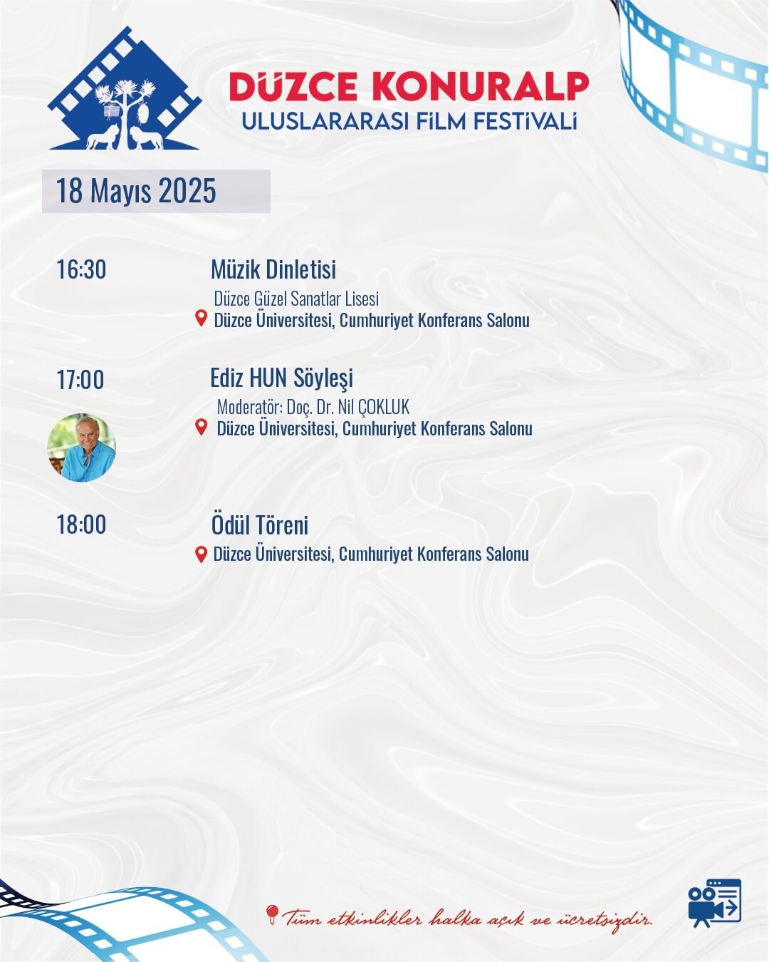 Kültür ve Turizm Bakanlığı Sinema Genel Müdürlüğü’nün katkılarıyla Düzce Valiliği, Düzce Belediye Başkanlığı, Düzce Üniversitesi ve Düzce Ticaret ve Sanayi Odası işbirliğiyle bu yıl birincisi gerçekleştirilen Düzce Konuralp Uluslararası Film Festivali 15 Mayıs tarihinde tüm hızıyla başladı.