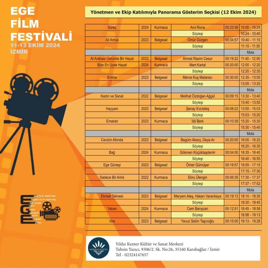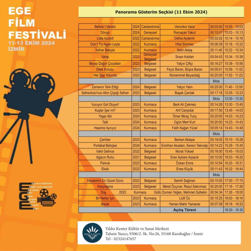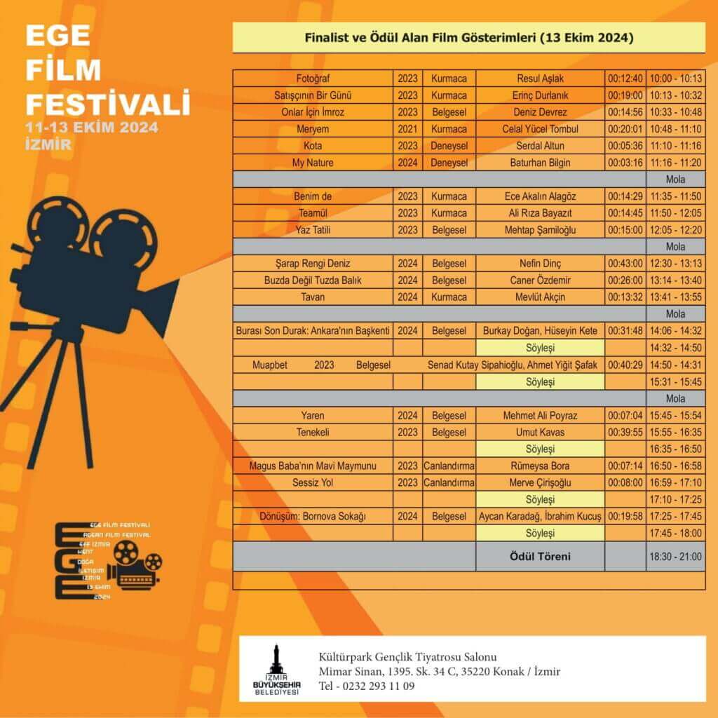 Film gösterimleri 11-12 Ekim günlerinde Yıldız Kenter Kültür ve Sanat Merkezi’nde (Karabağlar, İzmir), 13 Ekim’de ise Kültürpark Gençlik Tiyatrosu Salonu’nda (Konak, İzmir) gerçekleştirilecek.
