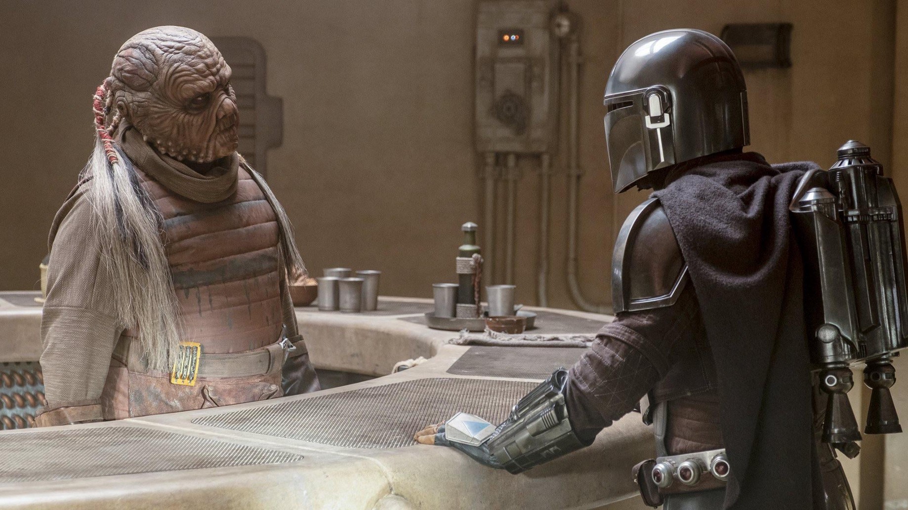 Mos Pelgos, Tatooine’de bir maden şehri. Mandalorian’ın olduğu iddia edilen şehir. Savaştan sonra yıkılmış, talan edilmiş ve haritalardan silinmiş bir şehir. Ancak tabi ki burada da bir yerleşim ve bu yerleşimde yaşayanlar var. Mando, girdiği ilk mekanda kendisine benzeyen birini görüp görmediklerini sorar ve ardından Şef dedikleri kişi mekana girer. Şef gerçekten de Mandalorian zırhı giyiyordur ancak Mando’nun düşündüğü gibi Mandalorian değildir. Mando, zırhı kendisine teslim etmesini ister, Şef ise buna karşı çıkar. Ve tam bu nedenle kavga edecekleri sırada kumda yüzen Krayt Ejderhası şehirde deprem etkisi yaratır ve kavgayı bir nevi önlemiş olur. Bu olayın ardından evrenin mottosu diyebileceğimiz karşılıksız iş yapılmaz sözünü tekrar hatırlarız. Tabi ki Şef Mando’ya zırhı verecektir ancak bir şartla. Krayt Ejderhası’nı yok etmesine yardım ederse zırhı Mando’ya teslim edecektir. Mando da gariban herkese iyi niyetle yaklaşıyor malum Şef’e de “Hayır, ver şu zırhı hemen!” diyemediği için tamam yardım ederim diyor.