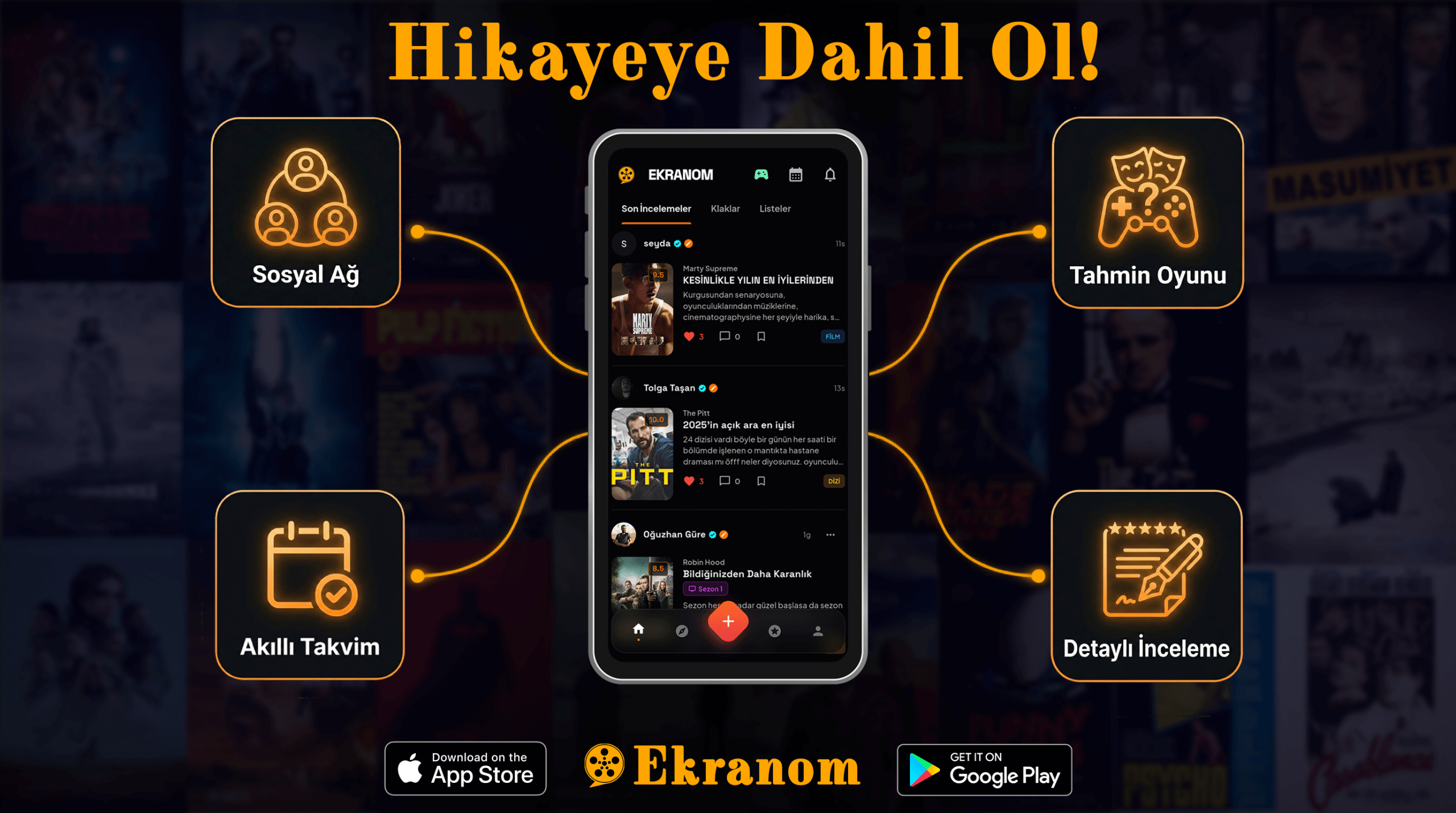 Siz de ekran başında yaşadığınız duyguları paylaşmak ve Türkiye’nin yeni sinema-dizi topluluğuna katılmak için hemen app.ekranom.com adresinden Ekranom uygulamasını indirebilirsiniz.